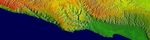 This image brightness corresponds to shading illumination from the right, while colors show the elevation as measured by the Shuttle Radar Topography Mission. Colors range from green at the lowest elevations to brown at the highest elevations. This image contains about 1400 meters (4600 feet) of total relief. The Arabian Sea is colored blue.