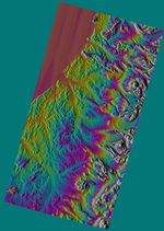 This image was generated using topographic data from the Shuttle Radar Topography Mission. Colors show the elevation as measured by SRTM. Each cycle of colors (from red through green back to red) represents an equal amount of elevation difference (400 meters, or 1300 feet) similar to contour lines on a standard topographic map. This image contains about 2300 meters (7500 feet) of total relief. For the shading, a computer-generated artificial light source illuminates the elevation data to produce a pattern of light and shadows. Slopes facing the light appear bright, while those facing away are shaded. Shaded relief maps are commonly used in applications such as geologic mapping and land use planning.
