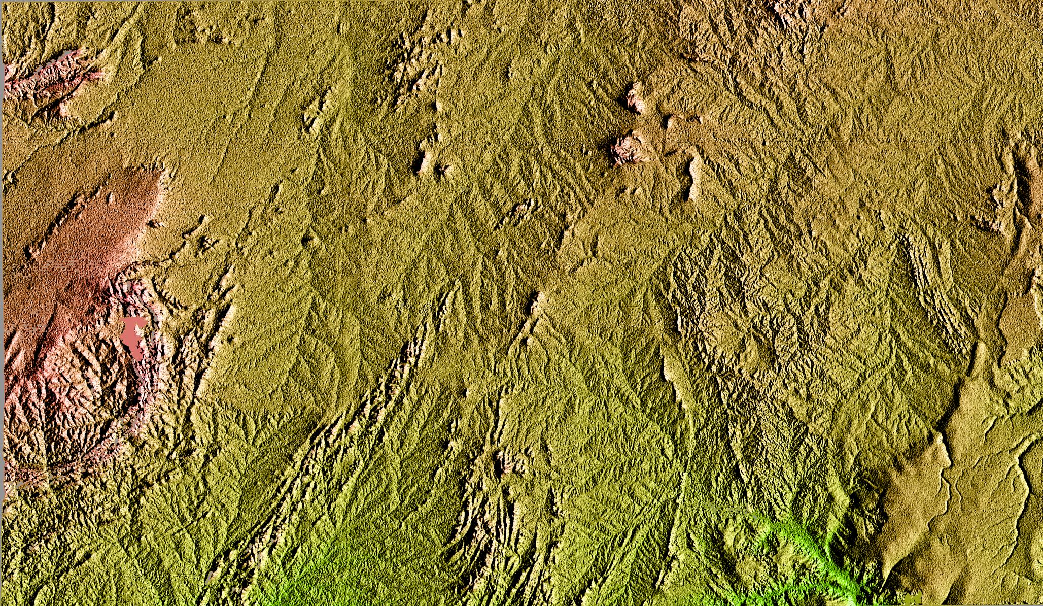 This shaded relief image was generated using topographic data from the Shuttle Radar Topography Mission. A computer-generated artificial light source illuminates the elevation data to produce a pattern of light and shadows. Slopes facing the light appear bright, while those facing away are shaded. On flatter surfaces, the pattern of light and shadows can reveal subtle features in the terrain. Colors show the elevation as measured by SRTM. Colors range from green at the lowest elevations to reddish at the highest elevations. Shaded relief maps are commonly used in applications such as geologic mapping and land use planning.