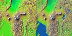 Lake Kivu is shown as black in the Shuttle Radar Topography Mission version (southwest corner). It lies within the East African Rift, an elongated tectonic pull-apart depression in Earth's crust. The rift extends to the northeast as a smooth lava- and sediment-filled trough. Two volcanic complexes are seen in the rift. The one closer to the lake is the Nyiragongo volcano, which erupted in January 2002, sending lava toward the lake shore and through the city of Goma. East of the rift, even more volcanoes are seen. These are the Virunga volcano chain, which is the home of the endangered mountain gorillas. Note that the terrain surrounding the volcanoes is much smoother than the eroding mountains that cover most of this view, such that topography alone is a good indicator of the extent of the lava flows. But this clear only at the higher spatial resolution of the shuttle mission's data set.