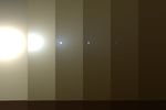 This series of images shows simulated views of a darkening Martian sky blotting out the Sun from NASA's Opportunity rover's point of view, with the right side simulating Opportunity's current view in the global dust storm (June 2018). The left starts with a blindingly bright mid-afternoon sky, with the sun appearing bigger because of brightness. The right shows the Sun so obscured by dust it looks like a pinprick. Each frame corresponds to a tau value, or measure of opacity: 1, 3, 5, 7, 9, 11.