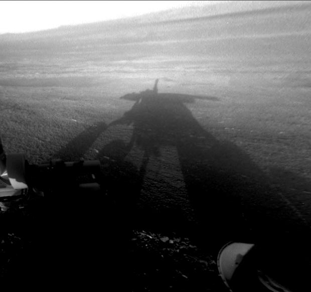 Opportunity's front hazard-avoidance camera took this image. The camera has a fisheye lens; the image has been processed to straighten the horizon. This view echoes one of the most popular images of Opportunity's long-lived mission, a shadow self-portrait (PIA06739) taken at Endurance Crater about eight years earlier.