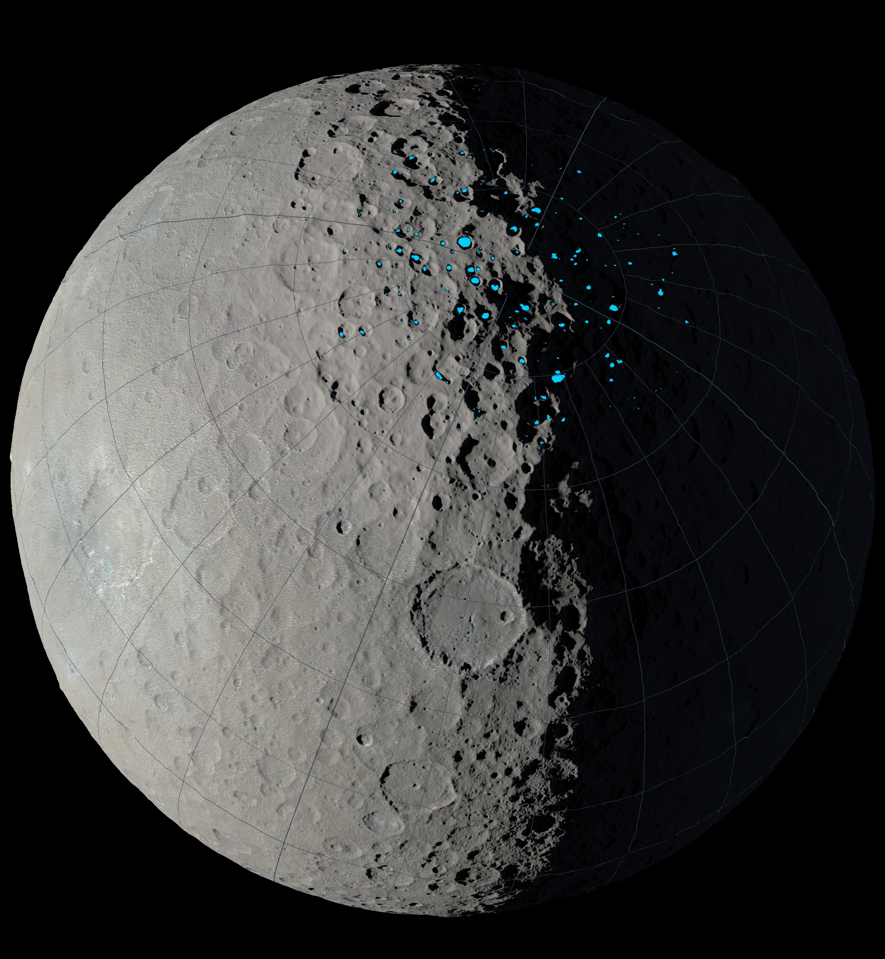 At the poles of Ceres, scientists have found craters that are permanently in shadow (indicated by blue markings). Such craters are called "cold traps" if they remain below about minus 240 degrees Fahrenheit (minus 151 degrees Celsius). These shadowed craters may have been collecting ice for billions of years because they are so cold.