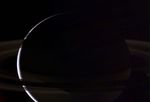 Saturn's southern hemisphere is lit on the night side by reflected light from the rings. The rings cast shadows onto the northern daylit hemisphere at the left, and can be seen in silhouette against the faintly illuminated `dark side' of the planet at the right.