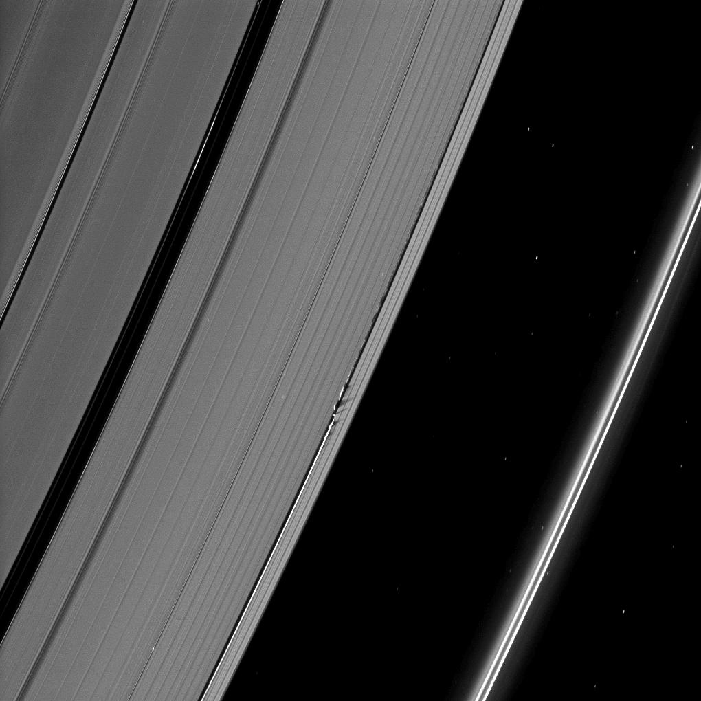 Daphnis (8 kilometers, or 5 miles across) appears as a tiny bright dot in the Keeler Gap of the A ring near the center of the image. The moon has an inclined orbit and its gravitational pull perturbs the orbits of the particles of the A ring forming the Keeler Gap's edge. It also sculpts the edge into waves having both horizontal (radial) and out-of-plane components. Material on the inner edge of the gap orbits faster than the moon so that the waves there lead the moon in its orbit. Material on the outer edge moves slower than the moon, so waves there trail the moon. See PIA11656 to learn more about this process.