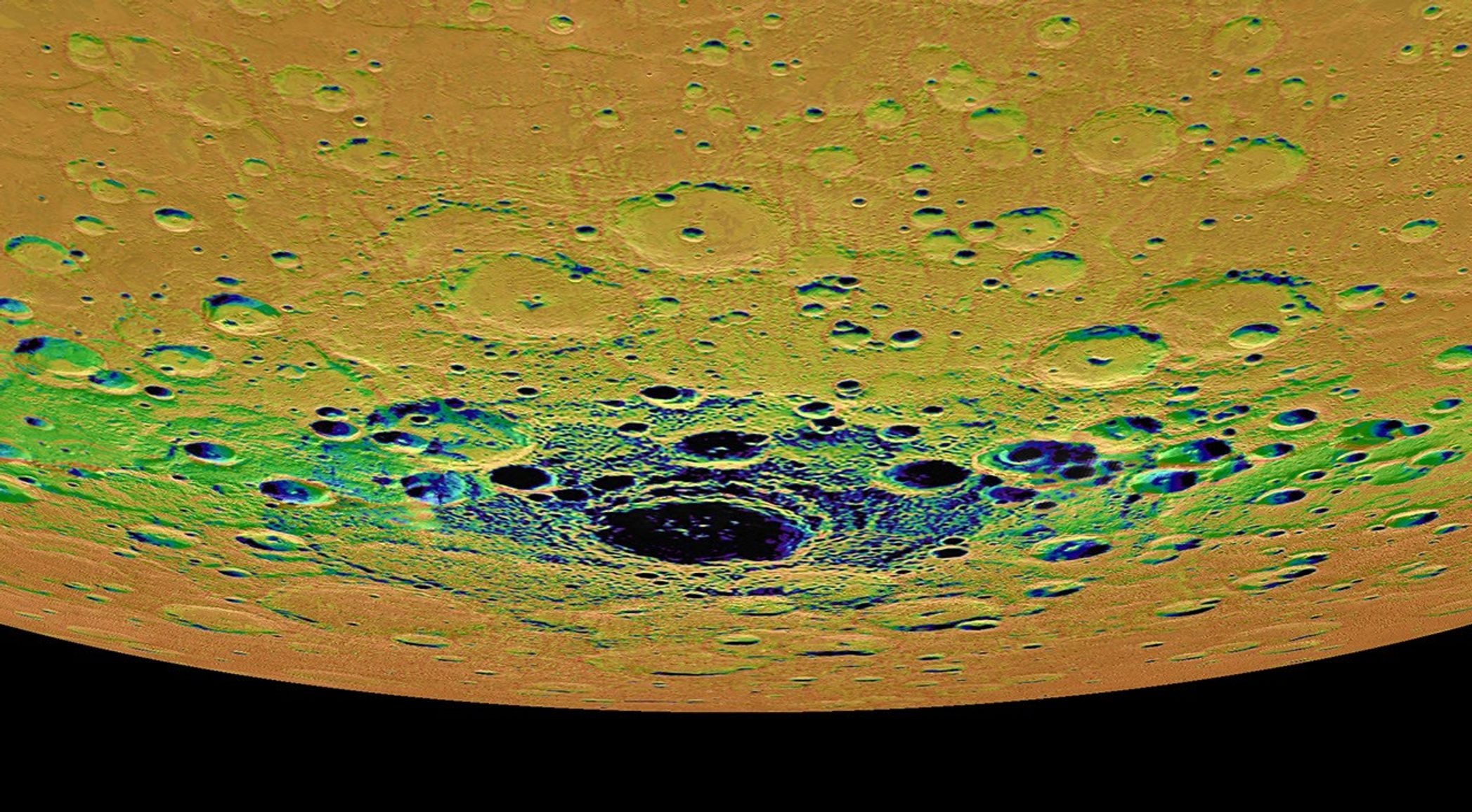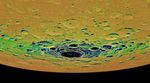 The view shown here is an orthographic projection of Mercury's south polar region, colored by an illumination map. The illumination map, created from repeated MDIS imaging, is colored on the basis of the percentage of time that a given area is sunlit. Areas appearing black in the map are regions of permanent shadow. The largest permanently shadowed region near the center of the image is within the interior of the crater Chao Meng-Fu, a location with evidence for hosting considerable amounts of water ice.