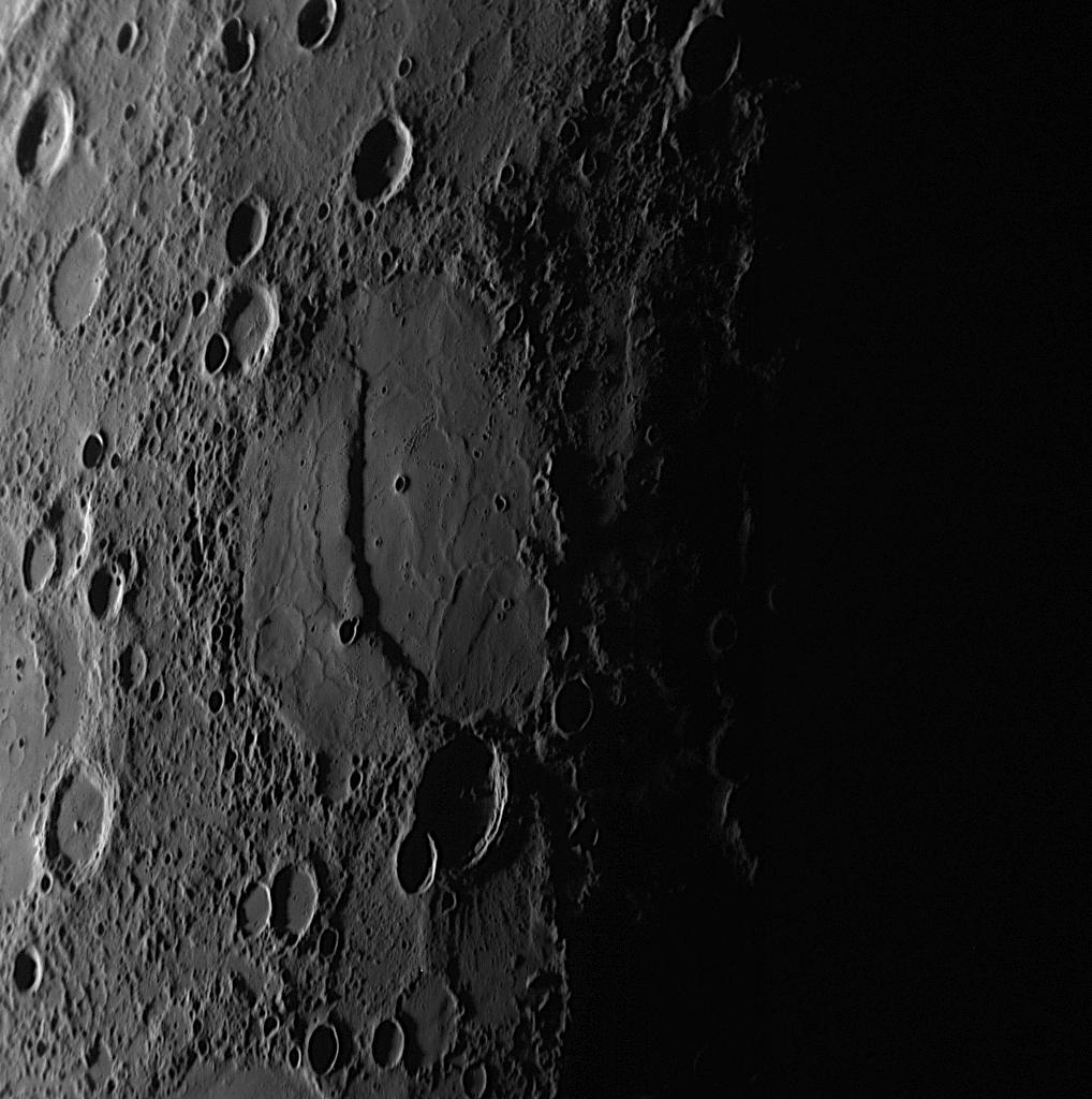 This NAC image was taken about 55 minutes before closest approach as the MESSENGER spacecraft sped toward a crescent-lit planet during the mission's second Mercury flyby (see PIA11247). The large crater in the center of the image is near the terminator, the division between the dayside and nightside of the planet. The low angle of the Sun near the terminator causes the long shadows seen here, which reveal that a large scarp or cliff bisects the crater. The crater exhibits a smooth floor broken by slight ridges and seems to have been filled with volcanic lava flows. In the lower left of the crater, the outline of a smaller crater that was filled to its rim by lavas is still visible. The scarp was formed after the large impact crater was filled with the lava flows, for if the scarp had formed first, then the lavas would have flowed over the scarp and buried it.