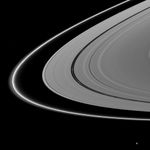 On the far left of the image, a small vertical structure in the thin F ring can be seen casting a shadow on the ring.