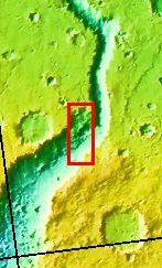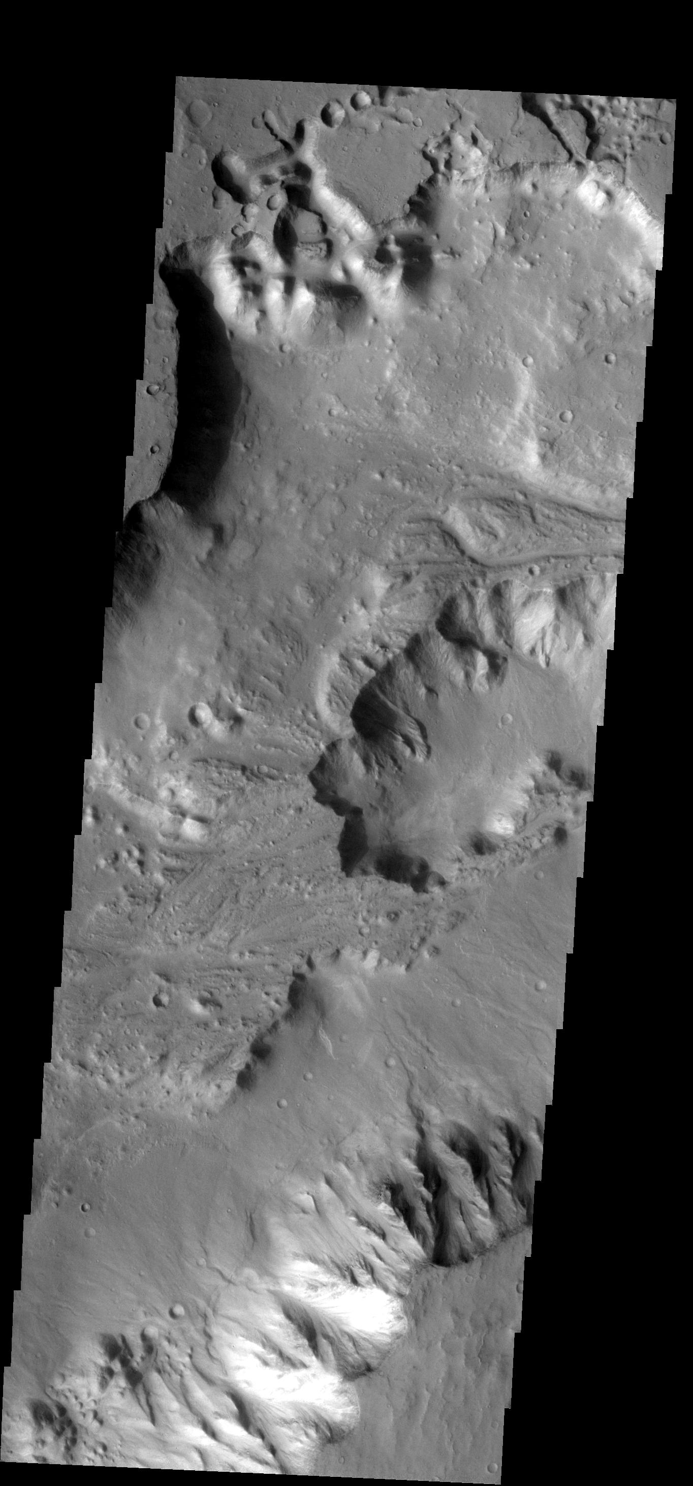 This image shows part of Shalbatana Vallis, with steep cliffsides and large pit in the channel floor. Many small channels appear to end at the pit, or pass to its north.