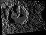 The large, unnamed crater in this image shares part of its wall with the younger, smaller (42 km/26 mi) unnamed crater that formed inside of it. The floor and rim of the smaller crater contains many hollows, which are difficult to make out in this high-incidence-angle image.