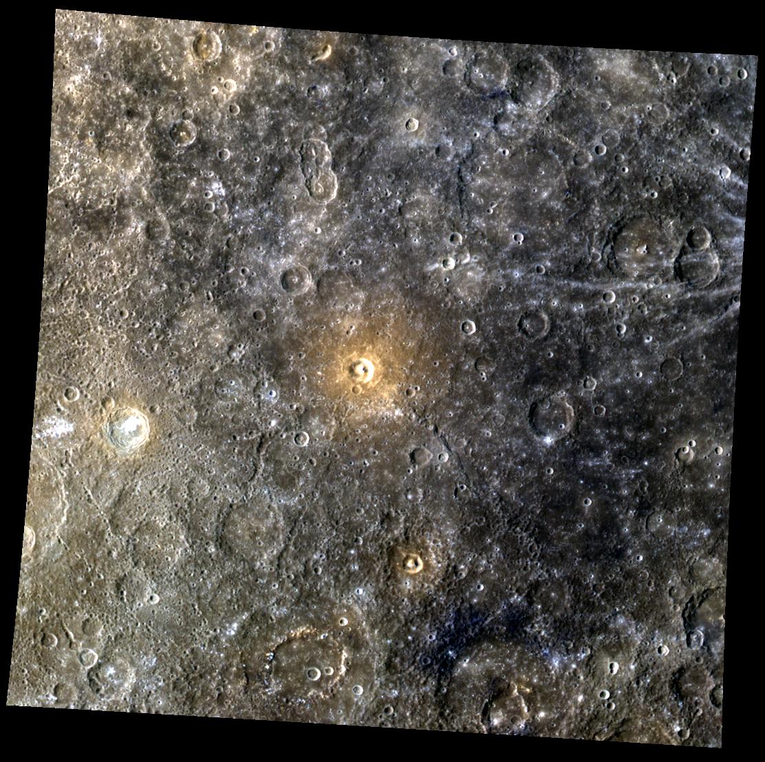 At the center of today's image is a "red spot," an informal designation used by the MESSENGER team to refer to an area with overall high reflectance and higher than average reflectance at the longer-wavelength (red) end of the spectrum. Red spots are thought to be sites of explosive (pyroclastic) volcanic eruptions. Such deposits were analyzed in a 2011 paper. A close-up of the crater at the center of the red spot was presented in a previous Gallery image. The crater neat the left edge of the image with bright floor deposits (hollows) is Theophanes.