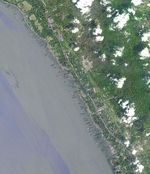 This image from NASA's Terra spacecraft shows the Bangladeshi coast north of Chittagong, where ships from around the world are beached and dismantled.