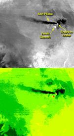 On the night of June 4, 2001, the Advanced Spaceborne Thermal Emission and Reflection Radiometer (ASTER) captured this thermal image of the erupting Shiveluch volcano. Located on Russia's Kamchatka Peninsula, Shiveluch rises to an altitude of 2,447 meters (8,028 feet). The active lava dome complex is seen as a bright (hot) area on the summit of the volcano. To the southwest, a second hot area is either a debris avalanche or hot ash deposit. Trailing to the west is a 25-kilometer (15-mile) ash plume, seen as a cold "cloud" streaming from the summit. At least 60 large eruptions have occurred here during the last 10,000 years; the largest historical eruptions were in 1854 and 1964.
