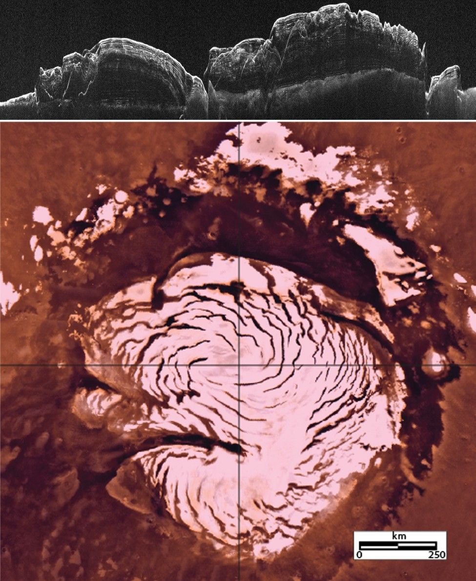 By analyzing radar images like the one at top, scientists discovered evidence for a past ice age in the northern polar ice cap of Mars.