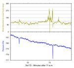 In this chart, the air-pressure scale is in Pascals. The wind direction scale is an estimate in degrees relative to the front of the rover. On Sol 75, the rover was facing approximately westward, and 90 degrees on this graph indicates winds coming from the north.