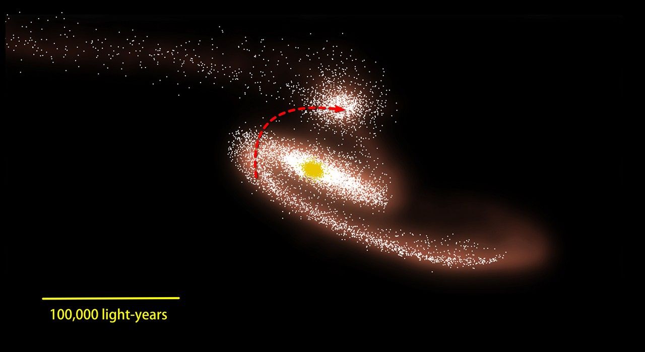 Computer simulations of the collision between NGC 6872 and IC 4970 reproduce the basic features of the galaxies as we see them today. They indicate that IC 4970's closest encounter occurred 130 million years ago and that the smaller galaxy followed a path (dashed curve) close to the plane of the spiral's disk and in the same direction it rotates.