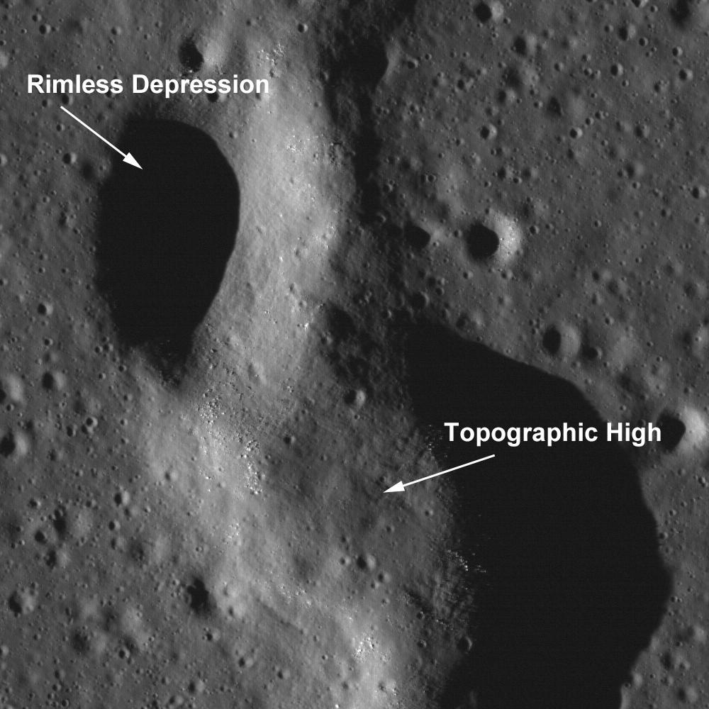 This unnamed sinuous chain of pits was suggested to be a collapsed lava tube (see Wilhelms' Geologic History of the Moon). New high resolution NAC images (e.g., M102443238R) provide a new look at the area. This particular feature transitions from a discontinuous sinuous rille into a wrinkle ridge. Some scientists have suggested that wrinkle ridge faults interact with lava tubes, with the wrinkle ridge exploiting a zone of mechanical weakness (the lava tube) in the preexisting basalt deposit. In this NAC image, the topographic depressions are non-circular, with collapse rims. Many of the pits have boulders on the interior walls. If these depressions were created by impacts, each pit would have a raised rim and an ejecta blanket.