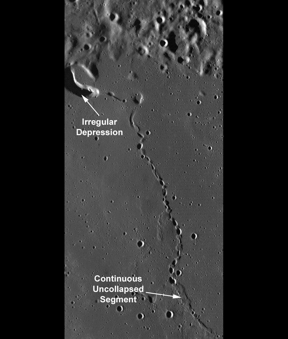 This section of WAC frame M117773324 shows the area where the feature transitions from a chain of collapse pits to a continuous uncollapsed segment. A large depression at the northern tip of the chain maybe a possible source region for the flow of lava across this region. The chain is approximately 50 kilometers long. Image resolution 58.9 meters/pixel