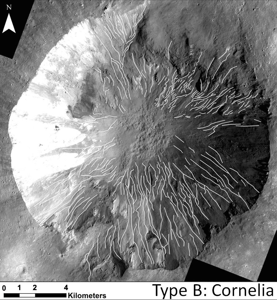 This image shows examples of long, narrow, sinuous gullies that scientists on NASA's Dawn mission have found on the giant asteroid Vesta. The crater shown here is called Cornelia. The gullies in Cornelia -- called "Type-B" gullies -- are different from the straighter, wider, shorter gullies that scientists have designated as "Type-A" gullies. Scientists think these two gully types have different formation mechanisms.