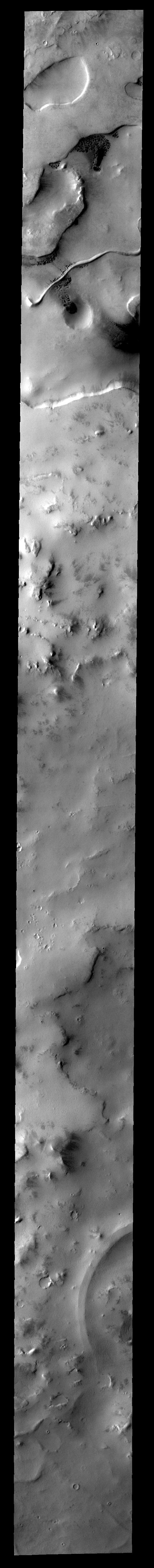 Note: this THEMIS visual image has not been radiometrically nor geometrically calibrated for this preliminary release. An empirical correction has been performed to remove instrumental effects. A linear shift has been applied in the cross-track and down-track direction to approximate spacecraft and planetary motion. Fully calibrated and geometrically projected images will be released through the Planetary Data System in accordance with Project policies at a later time.