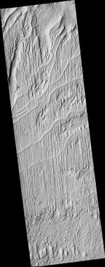 The southernmost sinuous features in this image are partially buried by linear ridge material, while in the northern part of the image they appear to stand above it. This could indicate that the linear unit has been more eroded in the north than the south, but may also be due to a more complex geological history in which different sinuous ridges formed at different times. In the northeast part of the image one sinuous ridge appears superposed on another, supporting this hypothesis.