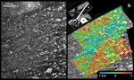 The left frame (a) is a mosaic of images taken by Galileo with a resolution of 180 meters (590 feet) per pixel superimposed on lower-resolution Voyager images. A swath of smooth terrain crosses the scene diagonally from upper right to center left. Irregularly shaped enclosures are interpreted as calderas, which, on Earth, are depressions typically caused by collapse of subsurface lava reservoirs. The numerous bright patches are due to secondary impacts from creation of a large crater, Osiris, which is out of the frame to the right.