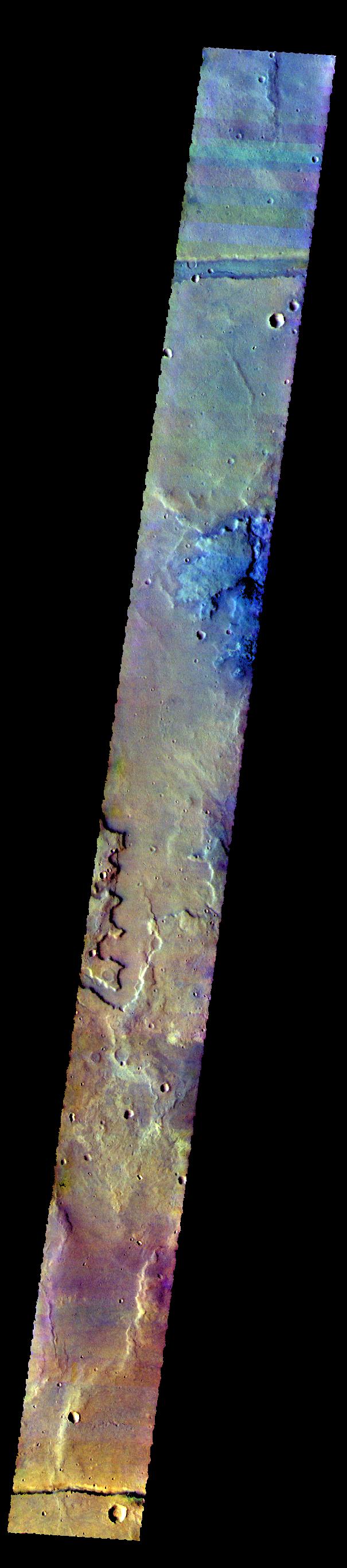 The THEMIS camera contains 5 filters. The data from different filters can be combined in multiple ways to create a false color image. These false color images may reveal subtle variations of the surface not easily identified in a single band image. The linear features at the top and bottom of this image are the graben called Sirenum Fossae.