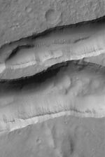 This Mars Global Surveyor (MGS) Mars Orbiter Camera (MOC) image shows layered material in the walls of troughs in the Sirenum Fossae region. Also notice large windblown ripples and boulders on their floors.