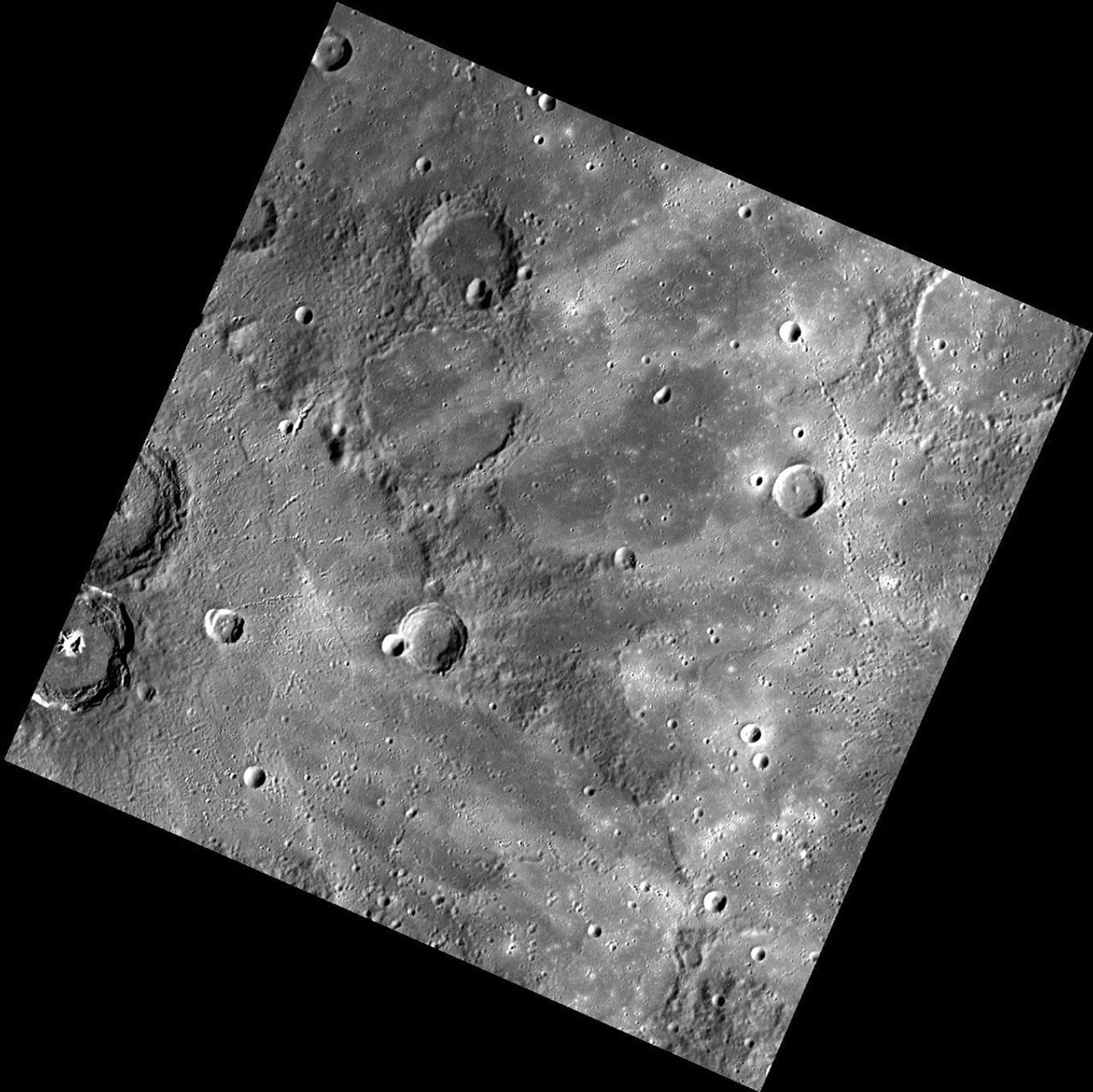 Today's image shows a complicated area of rays to the east of crater Bronte (named for sisters Charlotte, Emily, and Anne Bronte, and their brother Branwell). The rays trending roughly northeast-southwest originated from Degas, which formed just touching Bronte's rim. The roughly north-south ray (and secondary crater chain) on the right side of the image was probably formed by ejecta that came over the pole from Hokusai.