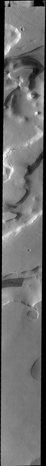 This VIS image shows part of Sisyphi Cavi located in Noachis Terra near the south polar cap. Cavi are defined as steep sided depressions. Gullies dissect the cliff tops and dunes are found on the floors of the depressions.