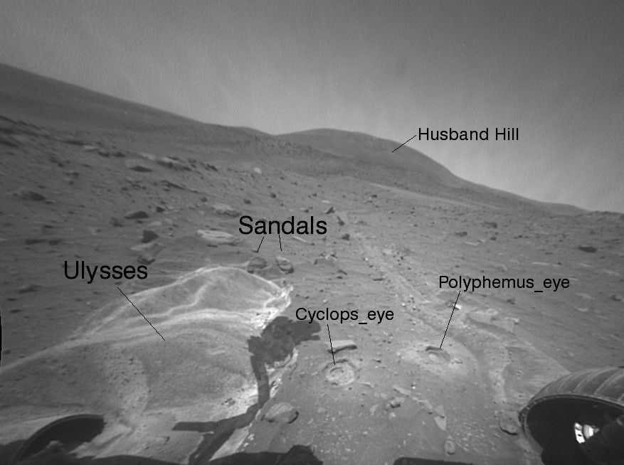 "Ulysses" is the area where Spirit's left wheels broke through a crust and stirred up poorly sorted, weakly cohesive sands. "Sandals" are two small rocks to the northwest of Ulysses. "Cyclops Eye" and "Polyphemus Eye" are two locations in which Spirit's rock abrasion tool was used to bore into the subsurface for detailed textural, compositional, and mineralogical measurements. Ulysses has the highest sulfate content measured by either Spirit or Opportunity. Cyclops Eye also has sulfate minerals beneath the surface whereas Polyphemus Eye does not. Thus Spirit must be sitting over a geologic boundary where materials are different to the west as opposed to the east.