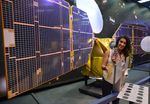 The full-scale mock-up of NASA's MarCO CubeSat held by Farah Alibay, a systems engineer at NASA's Jet Propulsion Laboratory, is dwarfed by the one-half-scale model of NASA's Mars Reconnaissance Orbiter behind her.