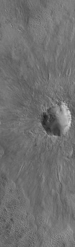 This Mars Global Surveyor (MGS) Mars Orbiter Camera (MOC) image shows an impact crater on the martian northern plains. This crater is roughly the size of the famous Meteor Crater in Arizona on the North American continent.