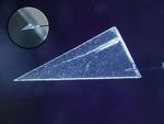 This image illustrates one of several ways scientists have begun extracting comet particles from the Stardust spacecraft's collector. First, a particle and its track are cut out of the collector material, called aerogel, in a wedge-shaped slice called a keystone. A specialized silicon pickle fork is then used to remove the keystone from the remaining aerogel for further analysis.