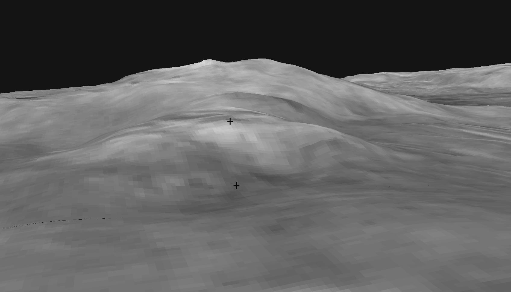 This digital elevation map shows the topography of the "Columbia Hills," just in front of the Mars Exploration Rover Spirit. Rover planners are currently plotting the safest route for Spirit to climb to the front hill, called "West Spur." The direct path from the bottom crosshatch to the top crosshatch may be too steep. Data from the Mars Orbital Camera on the orbiting Mars Global Surveyor were used to create this 3-D map.