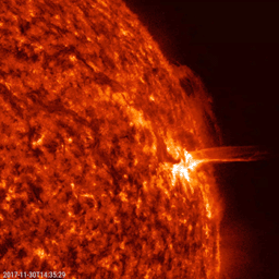A prominence at the sun's edge shifted and slithered back and forth over a one-day period (Nov. 29-30, 2017). Prominences are strands of charged particles suspended above the sun's surface that are pulled and tugged by magnetic forces. This kind of close-up also shows the kind of dynamic activity taking place all over the sun's surface. The bright area further down from the prominence is an active region, an area of intense tangles of magnetic forces. Towards the end of the clip, it blasts out a small stream of plasma (captured in the still). The images were taken in a wavelength of extreme ultraviolet light.