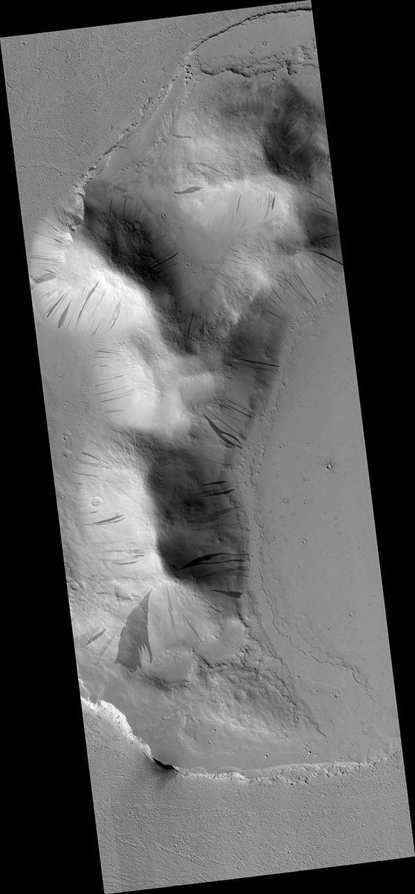 This particular image shows one of these dusty areas. The dark streaks on the slopes are locations where the dust has slumped downhill revealing a less dusty surface underneath. In some cases, these slope streaks might be triggered by Marsquakes or nearby meteorite impacts. Scientists think they form quickly: more like an avalanche than dust slowly creeping downhill.