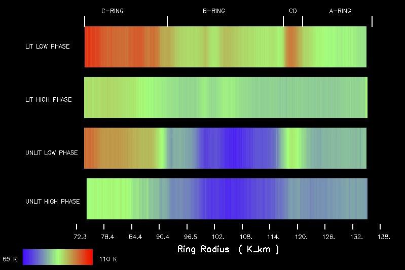 The C ring and Cassini Division exhibit the largest change in temperature. The temperature of the lit C ring decreases by about 22 degrees (12 Kelvin) between low and high phase angles. A similar contrast is present for the unlit side of the C ring. The C ring and Cassini Division are darker than the A and B rings so they can absorb more heat from the Sun. The lit B ring shows a temperature contrast of approximately 18 degrees (10 K) while the unlit B ring shows very little thermal contrast. Very little sunlight may make it through the thick B ring to its unlit side. The lit A ring is particularly interesting because the magnitude of the thermal contrast decreases with increasing radial distance from Saturn. The outer A ring shows only a small temperature change with phase angle, possibly because it contains smaller, or more rapidly rotating ring particles, which would have more uniform temperatures with phase angle.