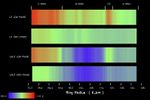 Four scans are shown for the lit and unlit rings, at relatively low (less than 60 degrees) and high (more than 130 degrees) phase angles. Warmer temperatures about minus 262 degrees Fahrenheit (110 Kelvin) are shown in red and cooler temperatures about minus 343 degrees (65 K) are shown in blue. Other colors indicate temperatures between minus 343 degrees and minus 262 degrees (65 K and 110 K). The top two scans are for the lit rings and the bottom two scans are for the unlit rings. The change in ring temperature between each scan can be seen clearly.