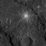 This small crater lies within the peak-ring basin Renoir. The image is stretched to highlight the details within the fresh crater's ejecta blanket, which is over two times brighter than the background terrain. Charged particles from the Sun and micrometeorite impacts will slowly alter the ejecta blanket and rays until this crater is indistinguishable from the many other small craters that surround it.