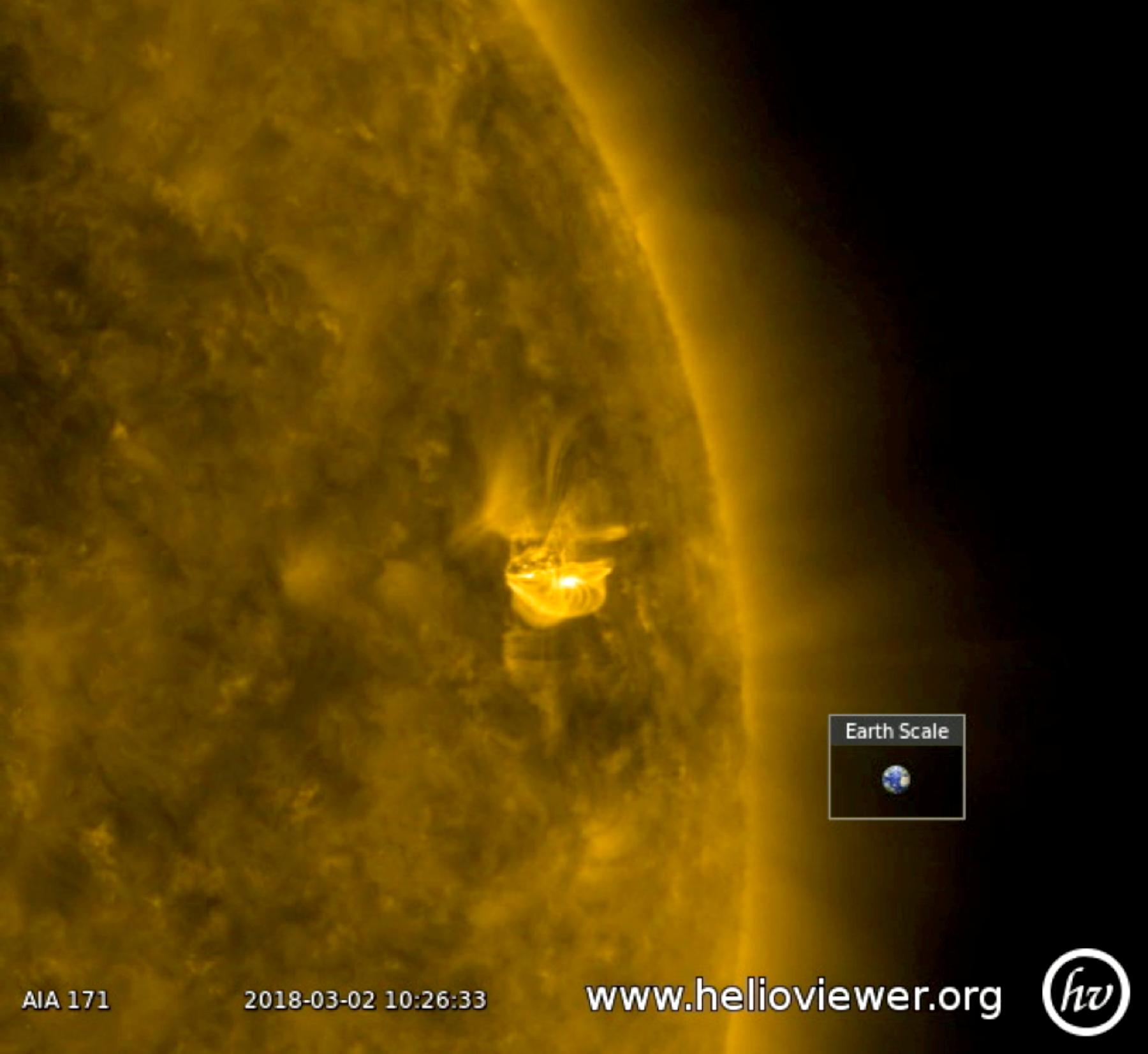 A relatively small active region erupted twice in 18 hours (Mar. 2, 2018). After each burst, one can see the magnetic fields lines, which appear as bright coils, spiraling around the region. They are reorganizing the disrupted magnetic field. The quick second when the screen goes black was caused by the Earth passing between the spacecraft and the sun. Images were taken in a wavelength of extreme ultraviolet light. The video was produced using the free Helioviewer software at Helioviewer.org.