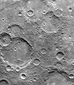 During its second encounter with Mercury on September 21, 1974, Mariner 10 took this picture (FDS 166673) of the planet's South Polar Region from a range of 57,300 kilometers (35,525 miles). The picture covers an area 480 by 370 kilometers (300 by 230 miles) and its center is located at 65 degrees S. latitude and 135 degrees W. longitude. Many of the craters have denuded rims peppered by smaller craters. Formation of the young crater at the bottom center caused a debris flow out onto the floor of the large crater. Many small craters cover the inter-crater plains. North is toward the upper left.