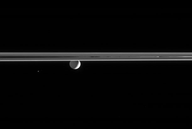 Gazing across the ringplane, the Cassini spacecraft spots a Saturn-lit Mimas and the tiny Trojan moon Helene. Only the bright crescent on Mimas' eastern limb is lit by the Sun; the moon's night side is illuminated by Saturnshine, or "greylight" as it is called by imaging scientists.