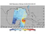 On the morning of Oct. 8, 2018, the NASA Soil Moisture Active Passive (SMAP) Radiometer got a snapshot of Hurricane Michael, which has intensified to a Category 2 hurricane over the warm waters of the Gulf of Mexico. The radiance acquired by the SMAP L-band Microwave Radiometer can see through clouds and rains, and is sensitive to the extreme ocean surface winds under a tropical storm or hurricane. Areas in red represent higher wind speeds; areas in blue have lower wind speeds.