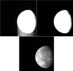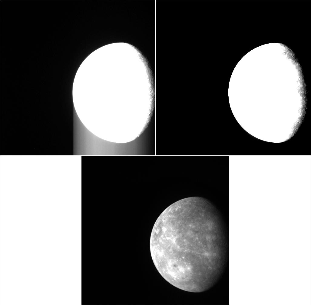 Here we see three views of an image collected during MESSENGER's first flyby of Mercury in January 2008. The top two images have had a harsh contrast stretch applied, to emphasize portions of the image with low signal levels. Notice that in the top left image there are bright streaks in the sky that extend from the edge of the planet toward the bottom of the image. These streaks are the result of "frame-transfer smear." An image exposed on the NAC's detector array is transferred to a memory zone in which the image is digitized, with the shift of each pixel's signal moving from top to bottom. The NAC, like most spacecraft cameras, does not have a shutter. Light continues to fall on the array during the approximately 4 milliseconds that are needed to complete the shift. As a result, some of the light is "misplaced" in the final raw image. It is a straightforward calibration step to remove the smear by subtracting the signal due to the extra light striking each pixel. The image in the upper right is shown with the same contrast stretch after application of the frame-transfer smear correction. The image on the bottom is the same calibrated image with a normal contrast stretch applied, allowing features on the surface of Mercury to be visible.