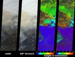 The two left-hand images are natural color views from MISR's nadir and 60° forward viewing cameras in which a pall of yellowish smoke is apparent both above the surface and above clouds in the top portion of the images. This area is near the junction of Canada's Keewatin region and Northwest Territory, and about 1200 km northward of the originalfire location. Lake Athabasca is at the lower left. The second panel from the right is MISR's standard stereo height product (derived from the nadir and the two 26° cameras), while the right-hand panel is a specially-generated product using MISR's 46° and 60° forward-pointing cameras. Because the smoke appears thicker at the oblique view angles, better areal coverage is obtained and the retrievals are less sensitive to the underlying cloud deck. The southern portion of the smoke cloud is at an altitude of about 3.5 km; however, the smoke further to the north has risen above the tropopause (which is at about 11 km altitude) and intruded into the lower stratosphere. These measurements indicate that smoke reaches heights of about 12-13 kilometers above sea level. The height fields pictured here are uncorrected for wind effects; wind-corrected heights (which have higher accuracy but sparser spatial coverage) for this smoke pall are about 0.5 km higher.