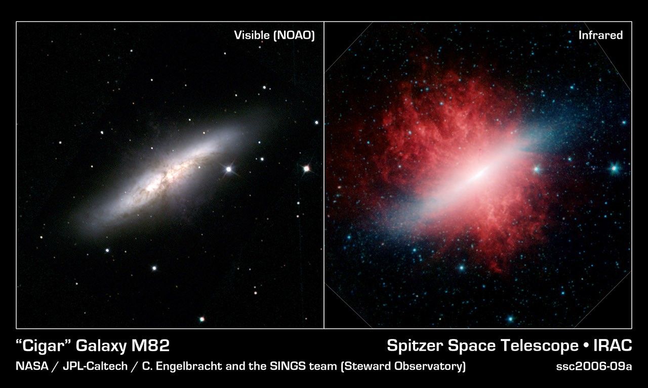 The visible-light picture of Messier 82, shows only a bar of light against a dark patch of space. Longer exposures of the galaxy (not pictured here) have revealed cone-shaped clouds of hot gas above and below the galaxy's plane. It took Spitzer's three sensitive instruments to show that the galaxy is also surrounded by a huge, hidden halo of smoky dust (red in infrared image).