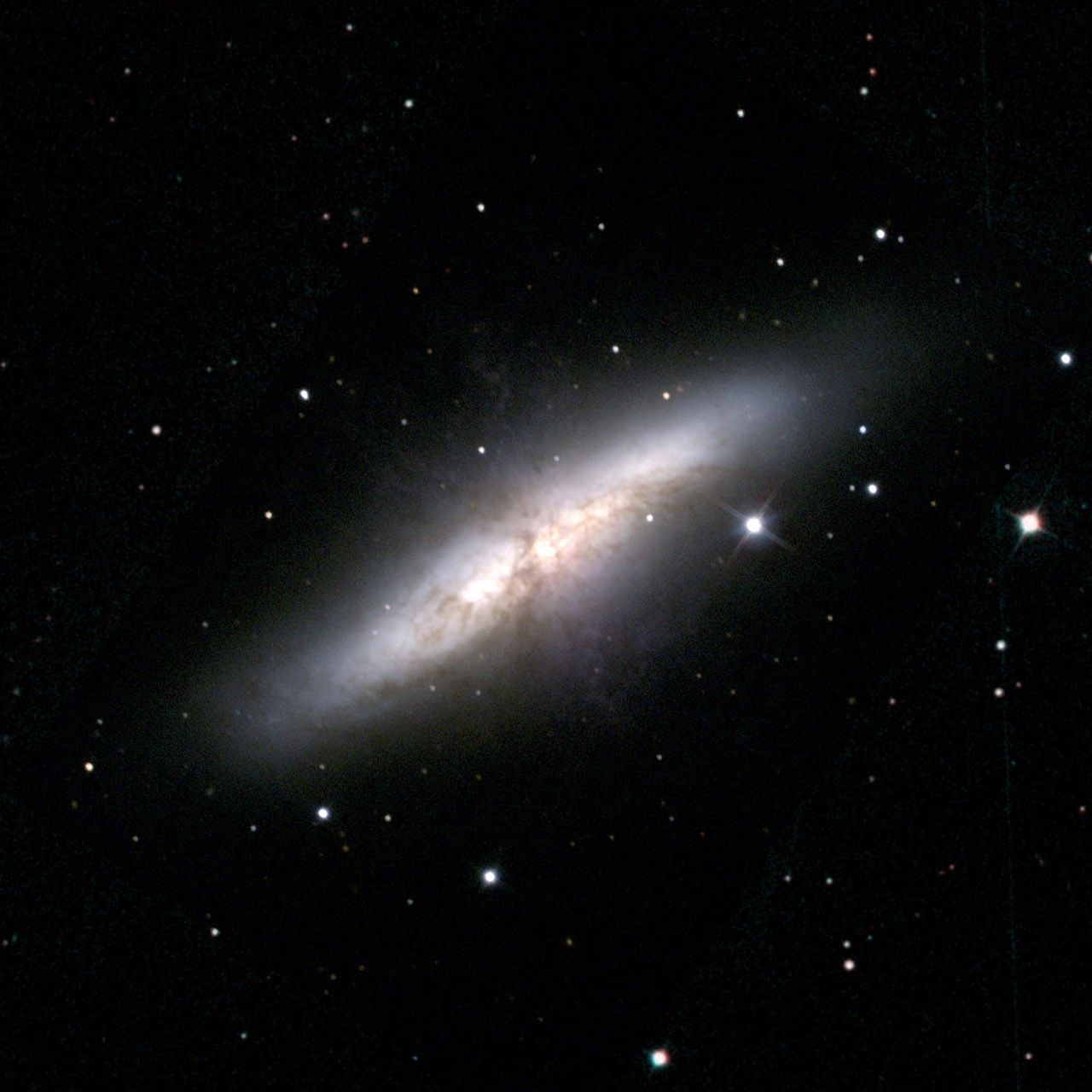 Messier 82 is located about 12 million light-years away in the Ursa Major constellation. It is viewed from its side, or edge on, so it appears as a thin cigar-shaped bar. The galaxy is termed a starburst because its shrouded core is a fiery hotbed of stellar birth. A larger nearby galaxy, called Messier 81, is gravitationally interacting with Messier 82, prodding it into producing the new stars.