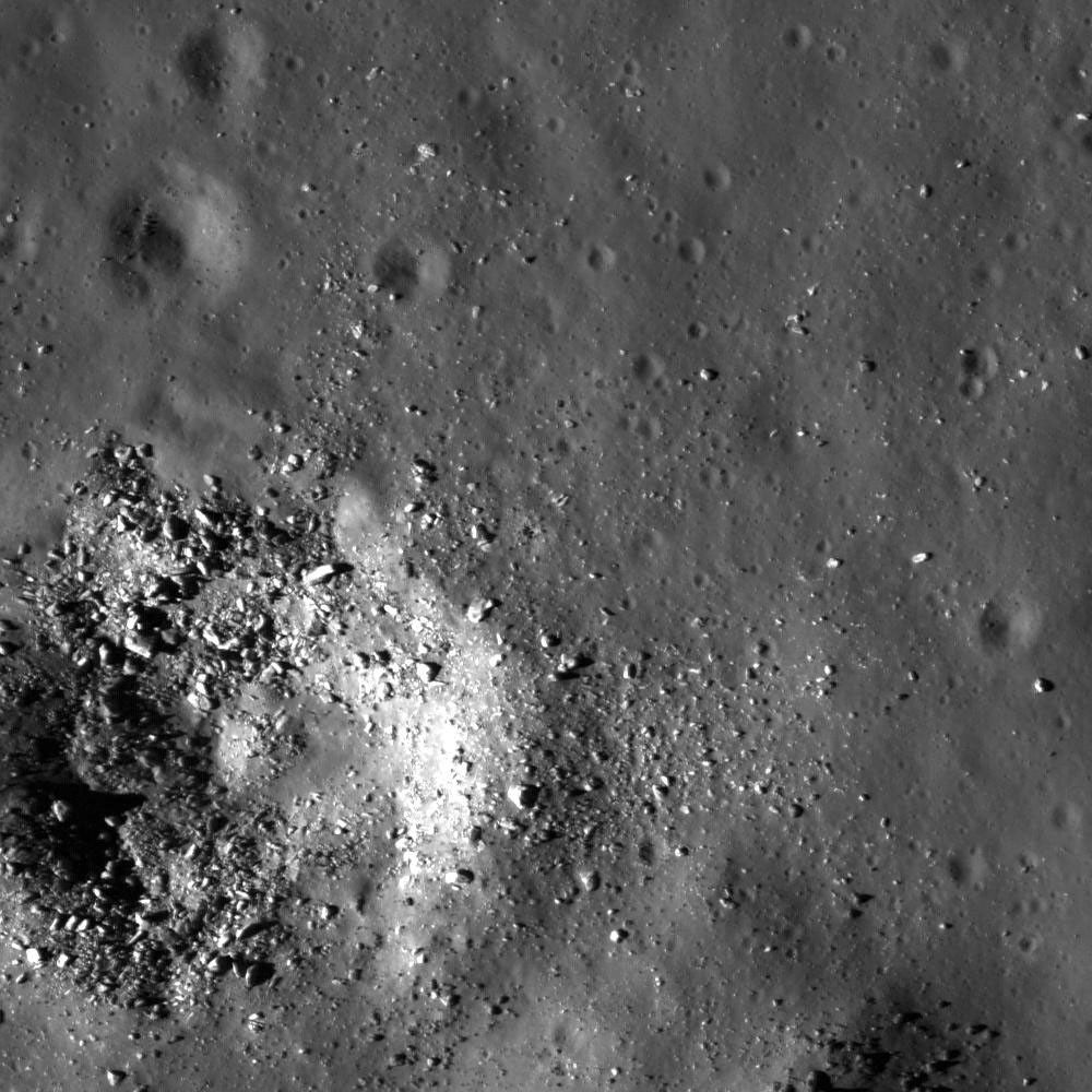 With the exception of recent impacts (such as this one) into the floor material of Copernicus, much of the northwestern floor of Copernicus appears smooth and relatively featureless (upper right corner). This region on the crater floor appears similar to mare basalt flows, but studies show that volcanism has not shaped the landscape of Copernicus' interior. Instead, it is possible that a vast volume of impact melt was created during impact and cooled differentially across the crater floor such that some areas appear smooth while others are hummocky. LROC NAC M135317661L, image width is 520 meters (1706 feet).