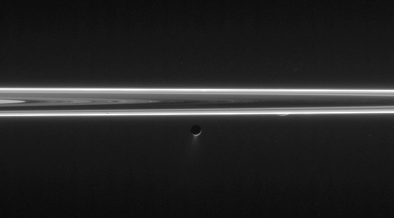 Enceladus blasts its icy spray into space in this unlit-side ring view that also features a tiny sliver of Rhea.